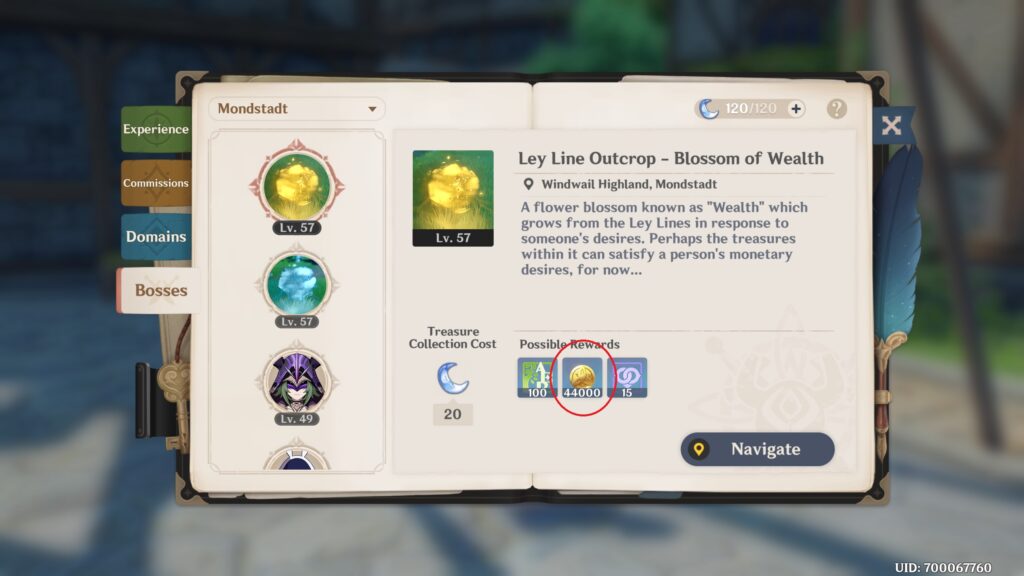 Ennek területnek a farmolása 20 resint kér/boss, és World Level-től függően adja a Mora mennyiségét.