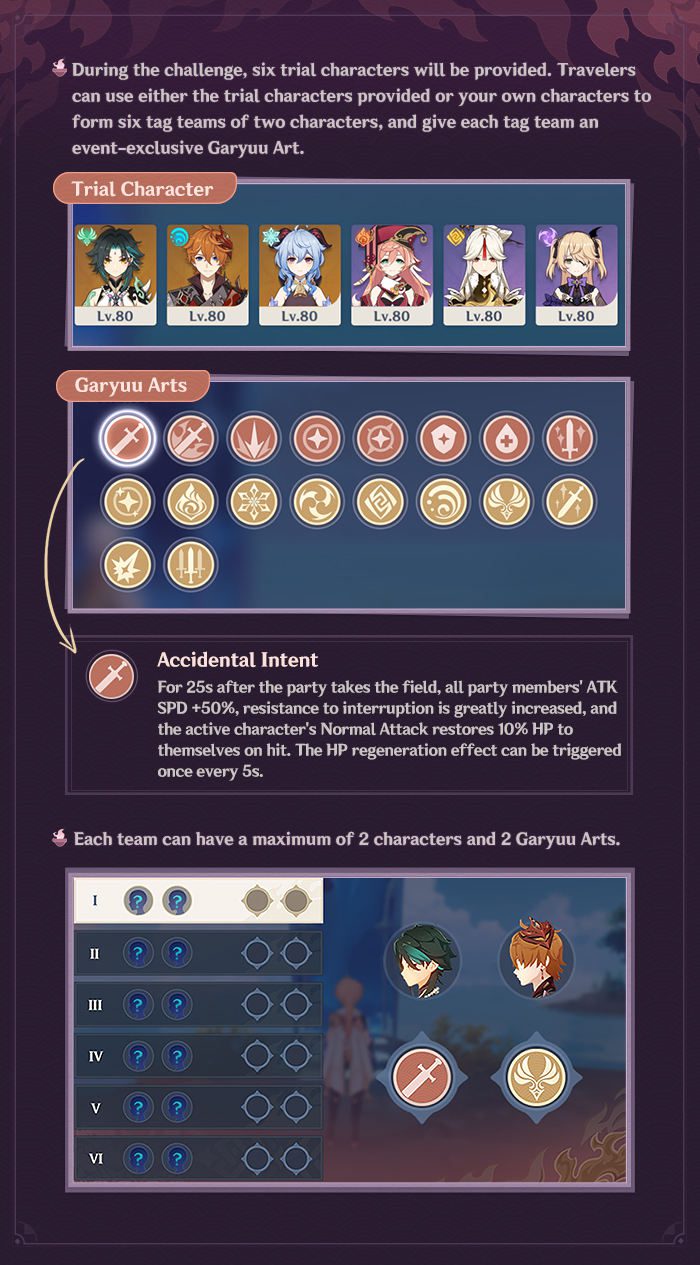 A kihívás alatt hat Trial karakter lesz elérhető. Az Utazók használhatják a Trial karaktereket vagy a saját karaktereiket, hogy hat, két karakterből álló csapatot alkossanak és a csapatoknak esemény exkluzív Garyuu Artot adjanak. Minden csapatban 2 karakter és 2 Garyuu Art lehet.