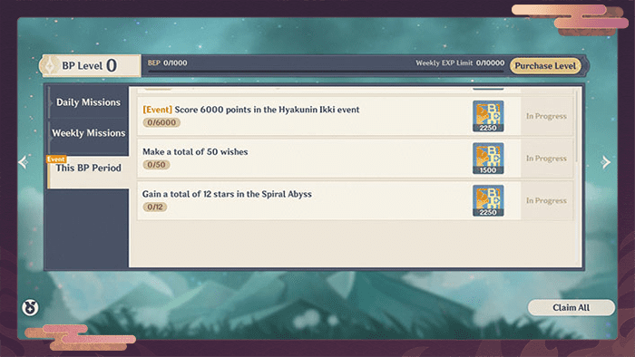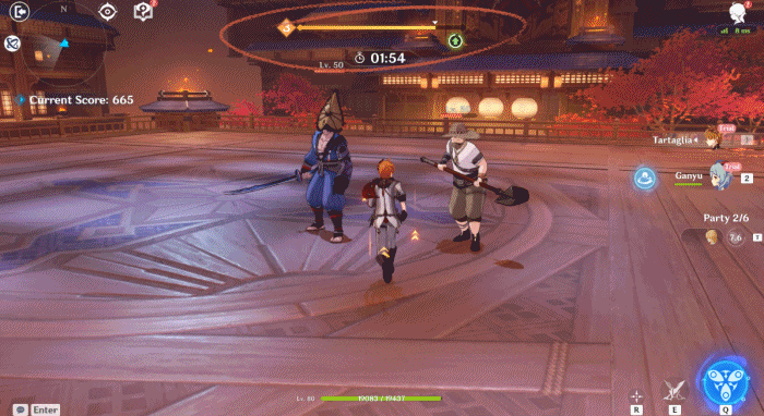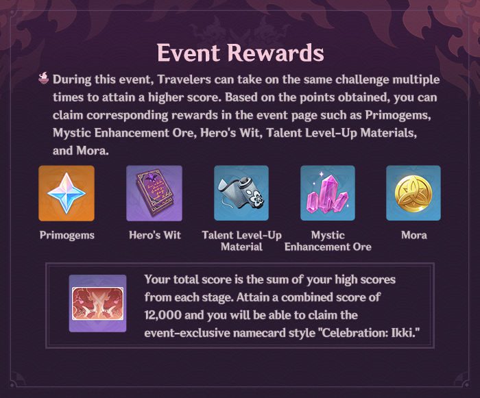 Az esemény alatt az Utazók egy kihívást többször is teljesíthetnek, hogy magasabb pontszámot érjenek el. Az elért pontok alapján, jutalmak szerezhetőek az esemény oldalán, mint például Primogemek, Mystic Enhancement Ore, Hero’s Wit, Talent Level-Up anyagok és Mora. A teljes pontszámod a legmagasabb pontszámaid összege az egyes szinteken. Érj el 12,000 kombinált pontot, és megkapod az esemény-exkluzív névkártyát: “Celebration: Ikki”