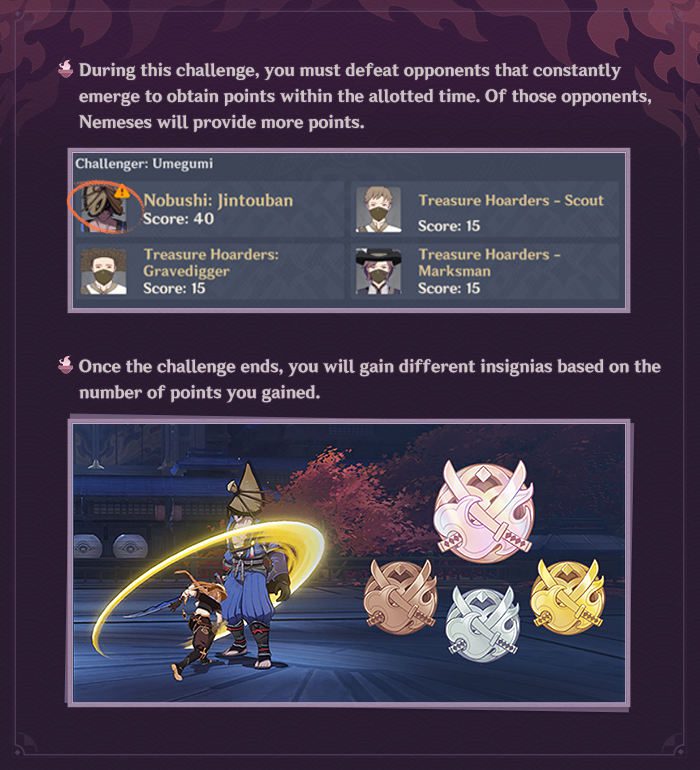 A kihívás alatt a folyamatosan érkező ellenfeleket pusztíthatod el, hogy pontokat szerezz a megadott idő alatt. Az ellenfelek közül a Nemeses több pontot ad.