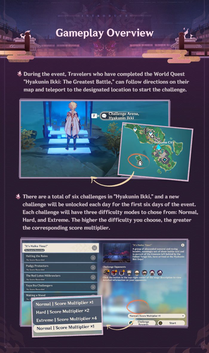 Az esemény ideje alatt az Utazók, akik teljesítették a „Hyakunin Ikki: The Greatest Battle” világ küldetést, a térképükön tudják követni az utasításokat és a kijelölt helyre teleportálva tudják elkezdeni a kihívást. Összesen hat kihívás van a “Hyakunin Ikki”-ben és naponta egy új kihívás lesz elérhető az esemény első hat napjában. Minden kihíváshoz három nehézségi szint közül lehet választani: Normal, Hard, Extreme. A magasabb nehézségi szint kiválasztásával, nagyobb lesz a hozzá tartozó pontszám szorzó is.