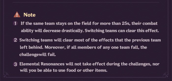 - Elemental Rezonancia nem lesz hatással a kihívás alatt, ahogy az ételek vagy más eszközök sem lesznek elérhetőek.