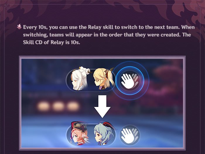 Minden 10 másodpercben használhatod a Relay képességet, hogy a következő csapatra válts. Mikor váltasz, a sorrendben következően kreált csapat fog felbukkanni. A Relay képesség újratöltési ideje (Cooldown) 10 másodperc.