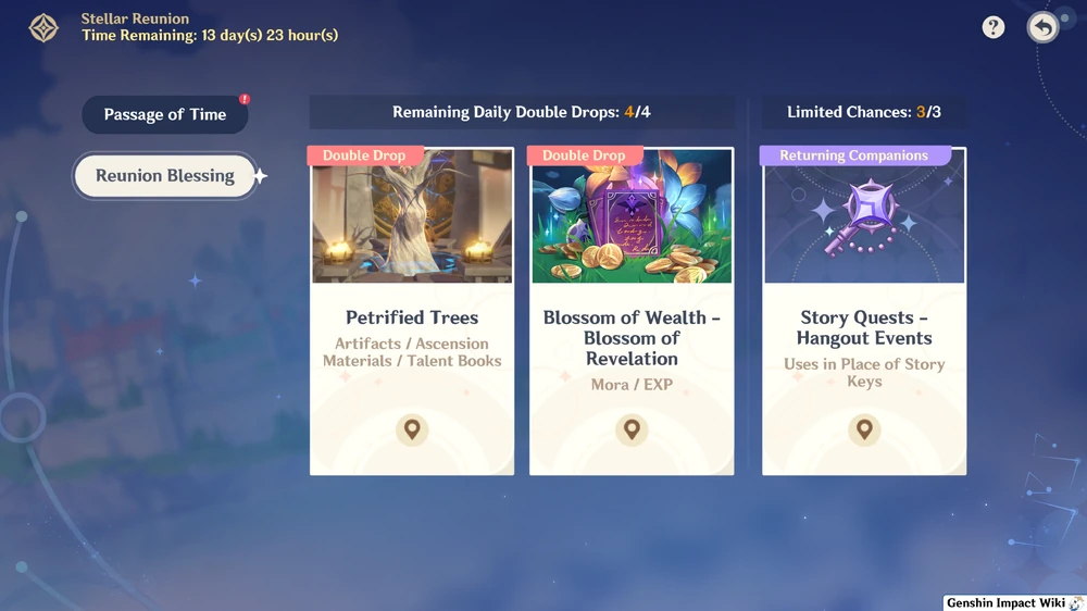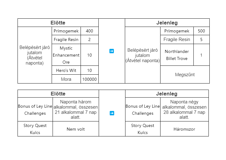 28 darab dupla droppos lehetőség, minden napra elosztva 4 darab, amit Artifact, Fegyver vagy Talent Alapanyag domainben lehet elkölteni, vagy akár Leyline-ok jutalmát is meg lehet vele duplázni.