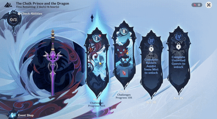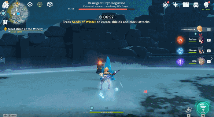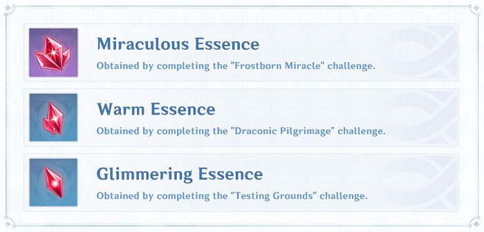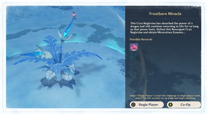Győzd le a Resurgent Cryo Regisvine-t a megadott időn belül a kihívás teljesítéséhez. Az Utazók elkérhetik a jutalmat, hogy megkapják a Miraculous Essence-eket, amelynek mennyisége arányos lesz a játékos világszintjével. A Miraculous Essence-eket az Eseményboltban el lehet cserélni olyan tárgyakra, mint a Festering Dragon Marrow, Talent Level-Up anyagok és Hero’s Witek.