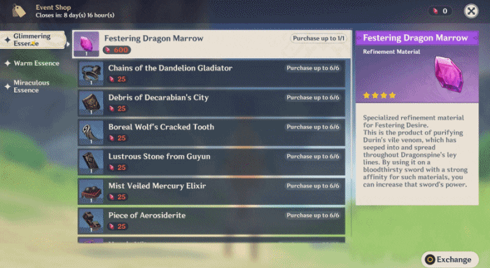 Az Essence-ek felhasználásával különböző tárgyakat vásárolhatsz az Eseményboltból, ideértve a Festering Dragon Marrow-t (refinement anyag a Festering Desire számára), a Fegyver Ascension Anyagokat, Hero’s Witet, Mystic Enhancement Ore-t, Talent Level-Up anyagokat és a Crown of Insightot.