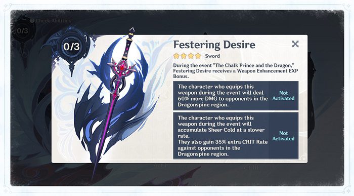 Az esemény során teljesíts meghatározott küldetéseket a „Festering Desire” fegyver és háromféle Essence megszerzéséhez. Az Essence-eket az Eseményboltban beválthatjátok olyan tárgyakra, mint Festering Dragon Marrow (refinement anyag a Festering Desire számára), Talent Level-Up anyagok és Crown of Insight.