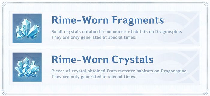 Az I. Act feloldása után a Dragonspine térségében található szörnyeket legyőzve Rime-Worn Fragmenteket és Rime-Worn Kristályokat szerezhetsz.